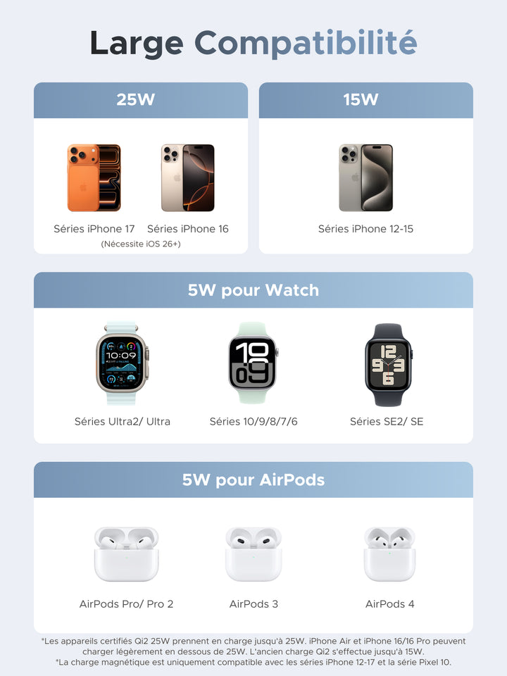 - Certifié Qi2 25W & MFi: Technologie Qi2 25W. Technologie Qi2 25W. Recharge Apple Watch à 80% en 45 min.